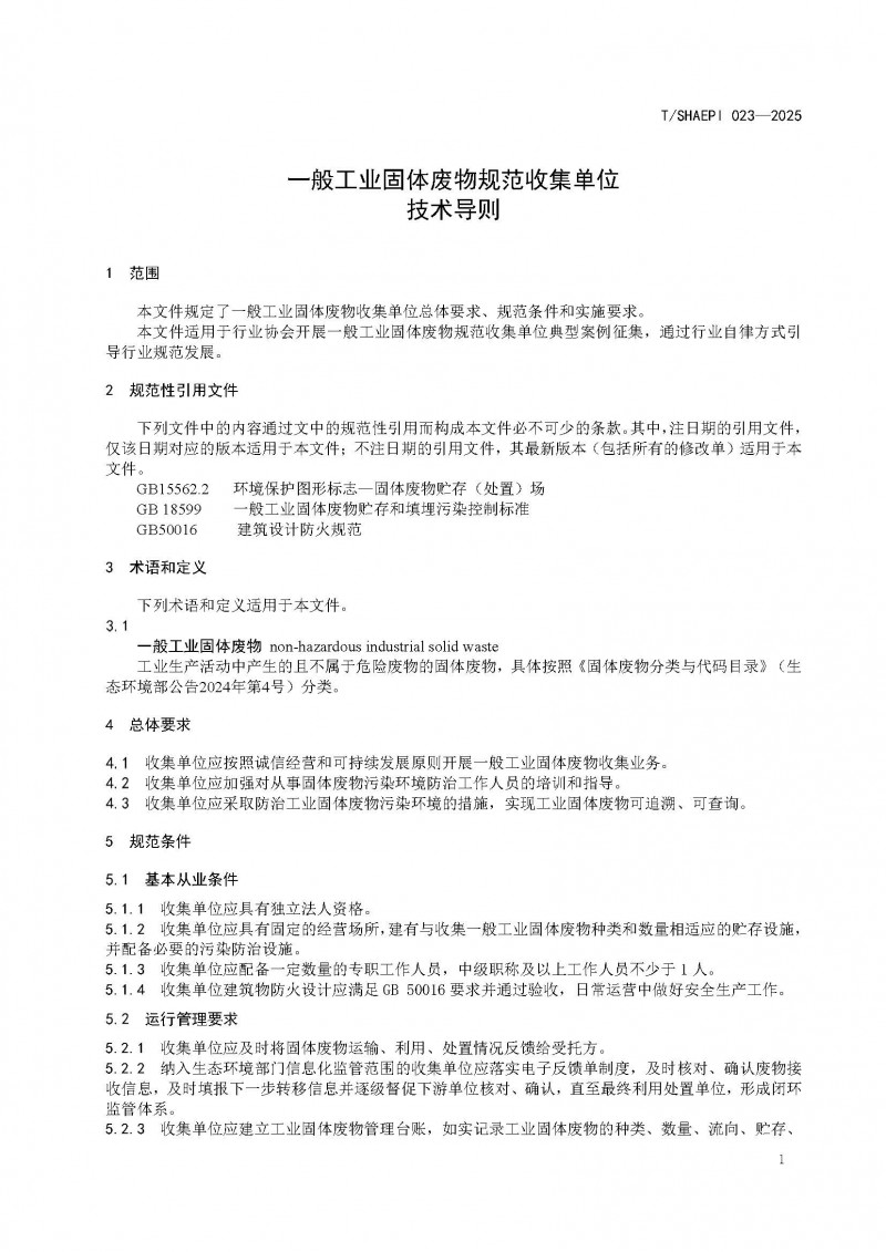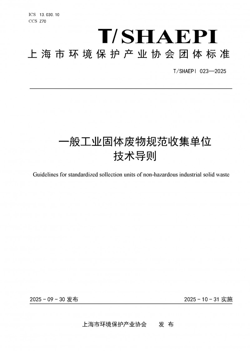 由上海市环境保护产业协会组织编制的团标《一般工业固体废物规范收集单位技术导则》已经完稿。