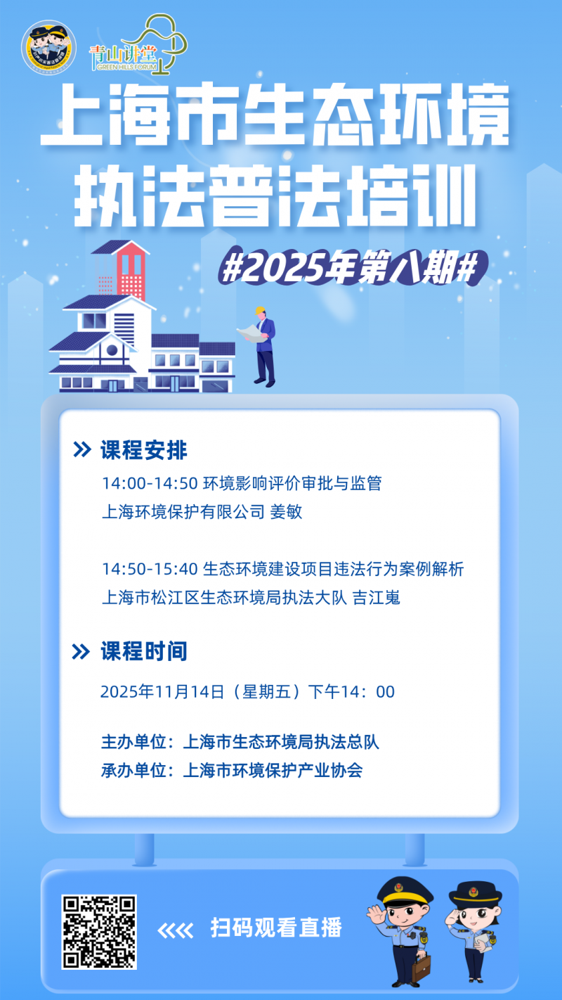 当前,建设项目环境管理正面临深刻的变革:环保法律法规体系日趋严密,环境执法力度持续加大,企业环境违法成本显著提高。然而,在实践中,许多建设单位和管理人员仍存在环境责任意识淡薄、对制度理解不深、执行不到位的问题。为进一步强化普法宣传,引导企业增强守法意识,履行建设项目从环评、建设到运营的全过程管理义务,由上海市生态环境局执法总队主办、上海市环境保护产业协会承办的2025年第八期生态环境执法普法培训即将开班。