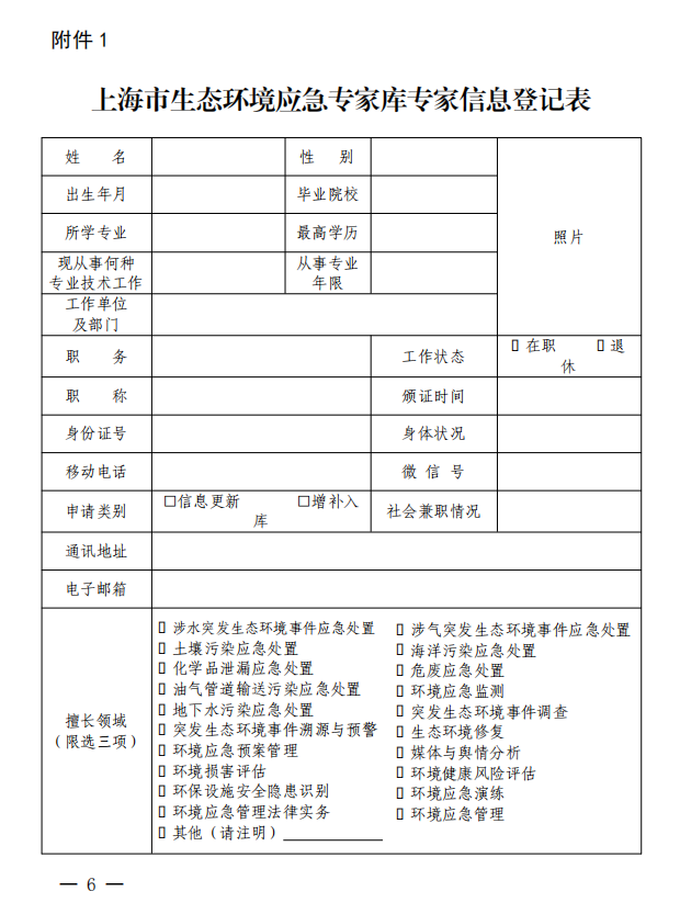 4.动态更新:已纳入《上海市生态环境局应急管理专家库专家名单(第一批)》的现有专家库专家需重新将专家登记表和承诺函发送至联系人邮箱。现有专家库专家进行信息“动态更新”,不受前述推荐名额限制。