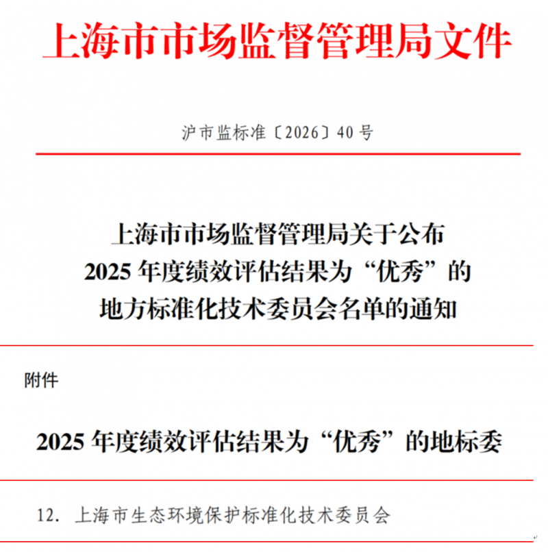 近日,上海市市场监督管理局公布了2025年度地标委绩效评估结果,经严格评审,上海市生态环境保护标准化技术委员会被评定为“优秀”。此项评定系对地标委在标准化领域履职成效与综合能力的权威认可,体现了在推动地方标准化体系建设中的重要地位与引领作用。