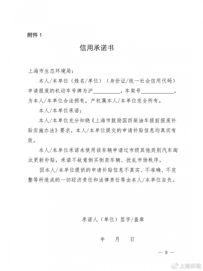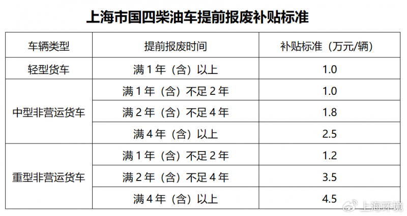为持续推动国四柴油车提前报废,市生态环境局会同市发展改革委、市交通委、市财政局制定了《上海市鼓励国四柴油车提前报废补贴实施办法》,全文如下↓