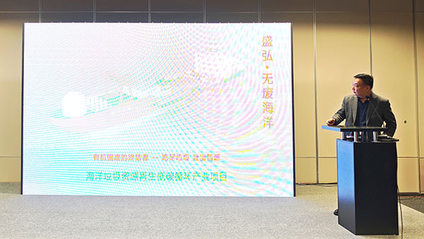 盛弘环境(海南)国际生态科技产业集团发展有限公司董事长卢岳峰介绍了有机质海洋固废的终端处置平台项目,利用“低温无氧干熘裂解”资源再生低碳循环技术将大部分海洋垃圾爱高值化转化为“油、气、炭”和“余热”等低碳循环再生能源。